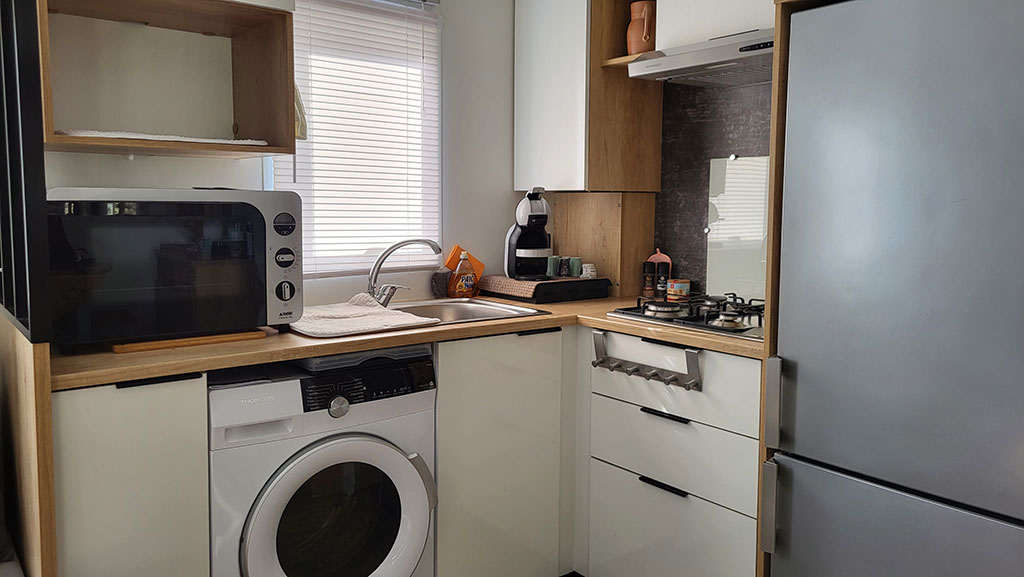 - Cuisine équipée : Evier – plaque de cuisson gaz 4 feux – hotte casquette aspirante – micro-onde – four – réfrigérateur 185L – congélateur 85L – cafetière Dolce Gusto – vaisselle pour 6 personnes – batteur électrique – appareil à raclette – appareil à fondue – mixer multifonction – robot multifonction.